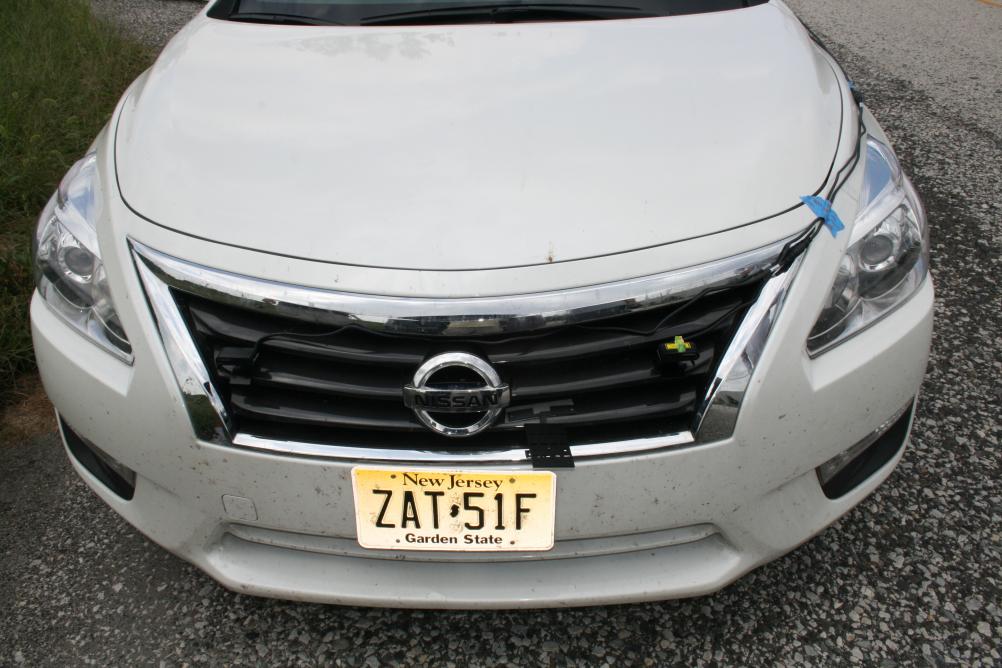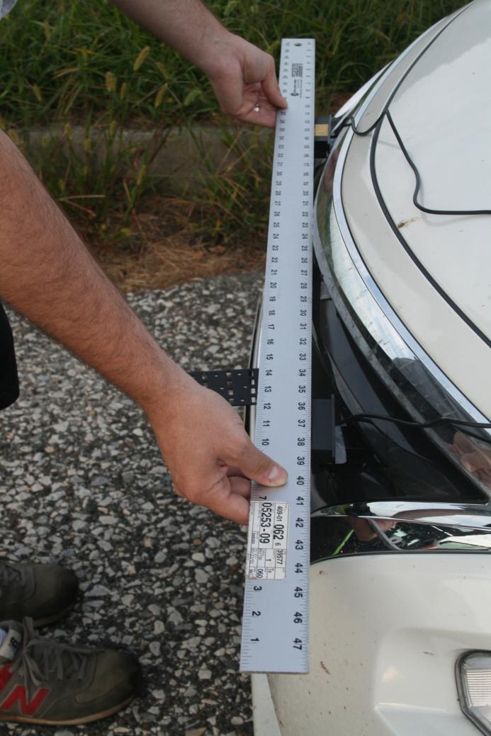 We rented a 2013 Metallic White Nissan Altima. We placed a Laser Interceptor mounting bracket on the grill as a car. We leveled the bracket while the car was parked on a level surface. We used this bracket as our “constant.”