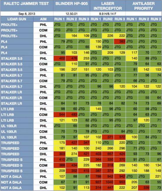 I was very surprised by the less than stellar performance of the Laser Interceptor against both the LTI Truspeed and Truspeed S. The Truspeed S has been an issue for some laser jammers. I am shocked by the punch throughs of 371 and 572 feet against the LTI Ultralyte 100LR (100pps), this gun has generally been easy to defeat by Laser Interceptor. For the “NOT A DALA” LIDAR, first I want to say that it is not a LIDAR that was designed, built or sold by Dragon Eye Technologies. It is another LIDAR that was designed, built and sold by one of the other LIDAR manufacturers. This LIDAR has a new firmware that was just recently released. Through RALETC’s contacts we were able to obtain this firmware very early in its release. The Laser Interceptor alerts to this new firmware correctly, but just doesn’t jam it. The pulse rate of this new firmware is the same as the old firmware. I believe that the manufacturer has altered the LIDAR’s filtering software that effectively filters out the Laser Interceptor’s jamming pulses. We have tested this firmware against Laser Interceptor’s 8.06, 8.07, 8.13 and 8.14 firmwares all will the same instant punch through result. Cliff, get in contact with me so you can crack this new firmware One thing to note about the Laser Interceptor is that it had the MOST “Jam To Gun” of all of the laser jammers tested. Also note that 40 out of the 90 runs resulted in punch throughs over 100 feet, and 20 of the punch throughs were over 300 feet. Even if you subtract the 8 punch throughs of over 300 feet by “NOT A DALA” there are still 12 punch throughs of over 300 feet, and if you subtract the 9 punch throughs of over 300 feet by “NOT A DALA” there are still 31 punch throughs of over 100 feet.