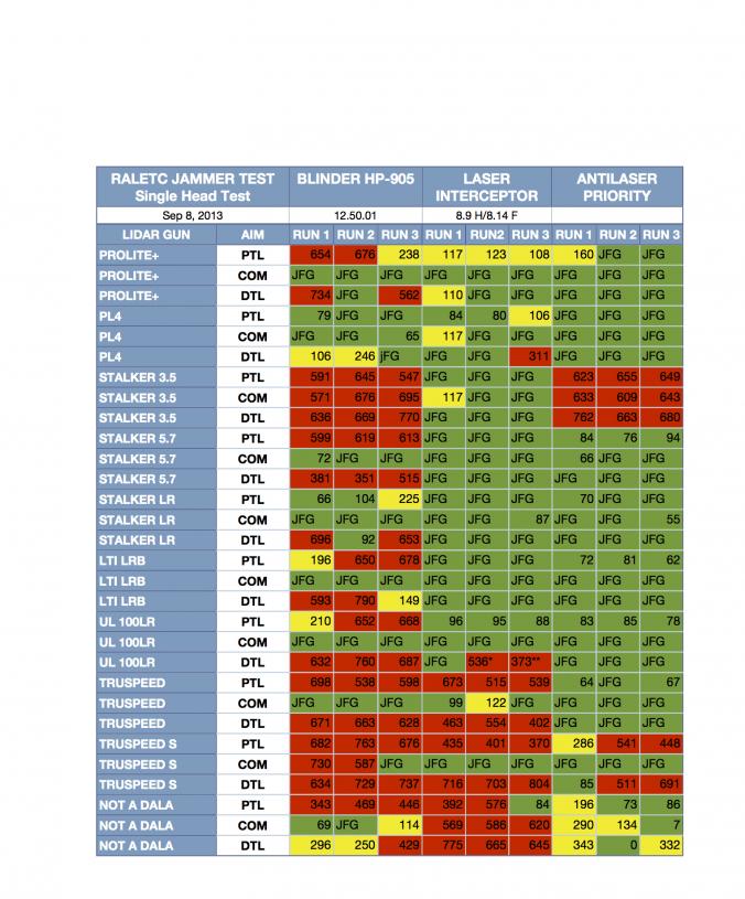 Because the Antilaser Priority had four receiving diodes, compared to two receiving diodes in the Laser Interceptor, I expected it to perform much better than the LI did. The Antilaser Priority had an average PT of 125 feet, but if you exclude the NAD, it drops a little to 120 feet. In this test, the Antilaser out performed the other jammers with the exception of the Stalker 3.5. Some will say that this is not an issue, because the Stalker 3.5 is not in service on the street. To me as an enthusiast, I am concerned about this result. I want to know what is the best, and I want to figure out why this happened, and what can be done to make the laser jammer perform better. All Stalkers have the same pulse rate. The differences between the versions are: 1. Filtering software to detect jamming, back round IR noise, and inaccurate readings. 2. Optics between the Stalker LR and the Stalker Lasers. 3. The different beam pattern of the earlier Stalker LIDAR, and the later Stalker LIDAR and LR. Which one of these differences is causing the Priority not to jam the 3.5 well, I am not sure, but I think it may have to do with the lower power output of the Priority compared to the LI, and the filtering firmware of the 3.5.