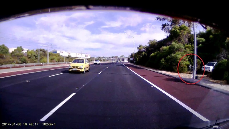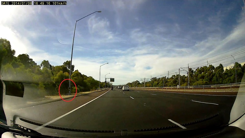 100km/h zone - front facing Vitronic PoliscanSpeed setup on tripod on the verge on the left (base of light pole).Support car backed well into the bushes (see rear video).Poliscan is setup on a gentle curve, and quite angled across the carriageway to minimise lidar detection range
