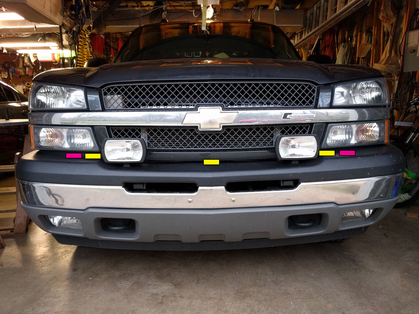 Good eyes. The violet hashes are 22" and the yellow are 20" on the centers. 20 kind of puts their faces too close to the auxiliary lights perhaps causing an off axis blockage. If I have them protruding 3/8" from under the DRL lights the sensor faces would be 3-1/4" behind the aux light lens.