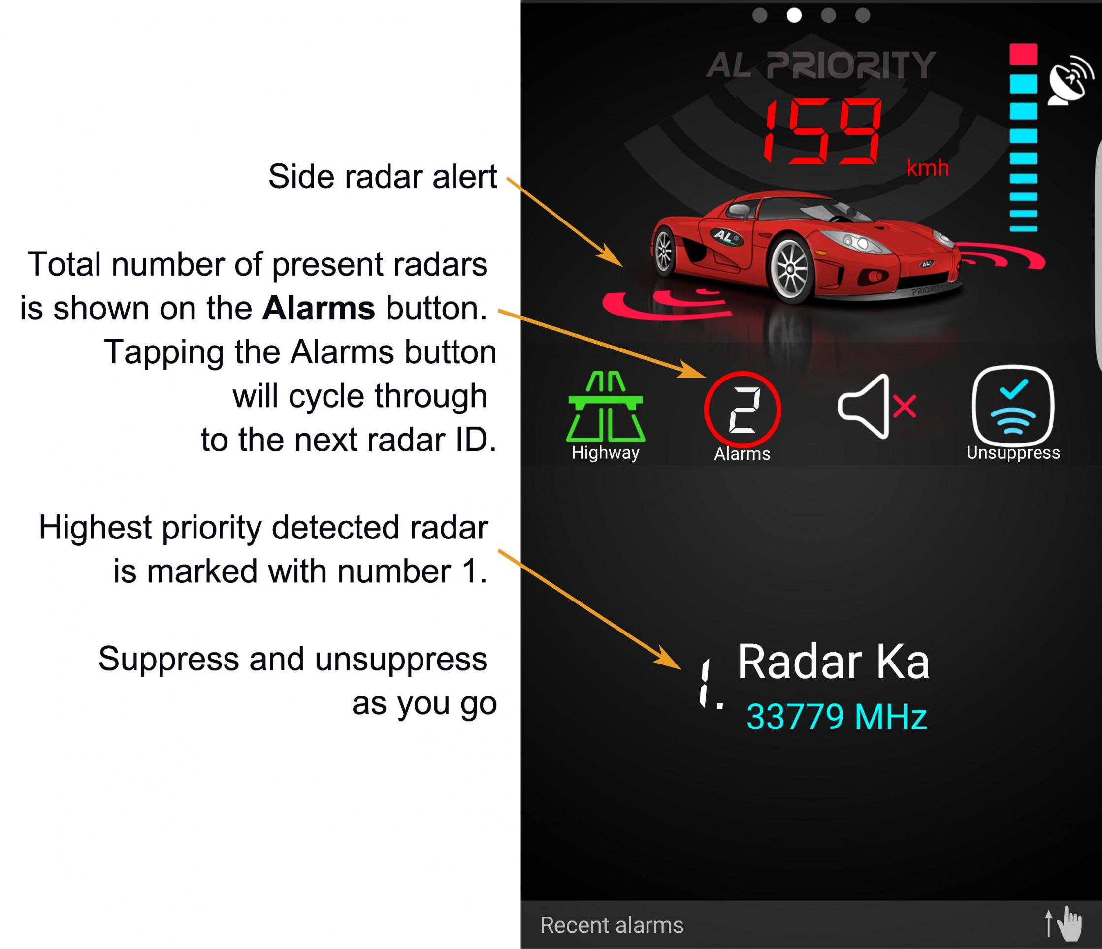 System analyzes the strength and importance of different radar sources and the one with the highest priority is alerted to on a wired control set. Multiple radars can be seen and handled in more detail in the ALPConnect application. (NOTE: this feature is active only when using radar antennas supporting multiple radar detection.)